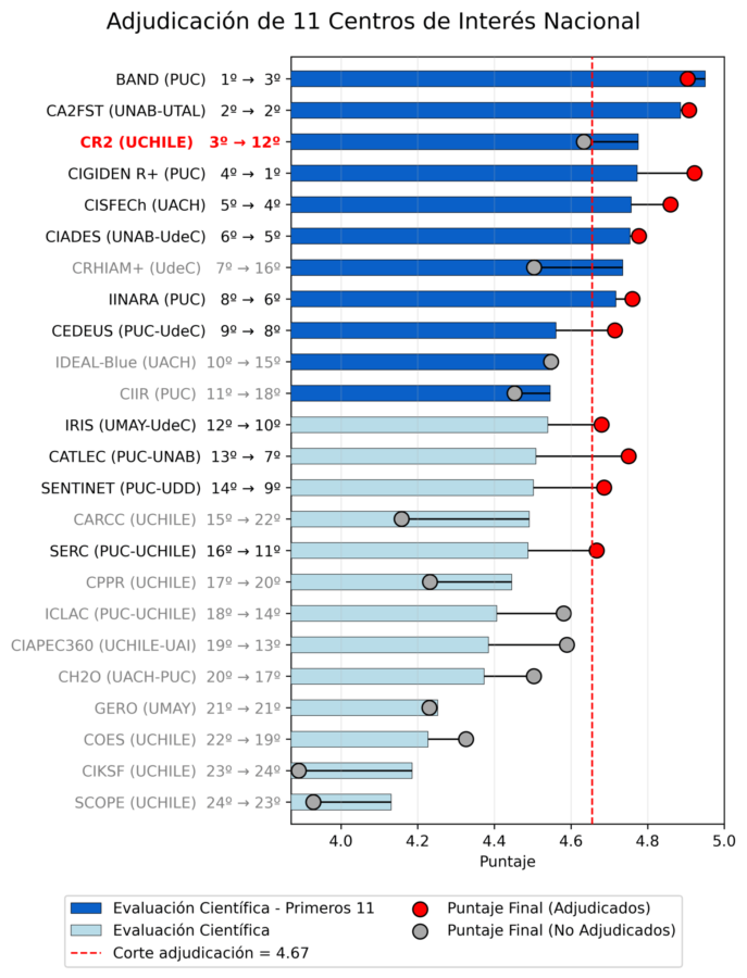 • Una caída decisiva del CR2 del puesto 3 al 12 (y posteriormente al puesto 16). El centro obtuvo un desempeño científico sobresaliente —de las 44 propuestas evaluadas, obtuvo la tercera mejor evaluación en el ámbito científico global y segunda mejor evaluación en la etapa de entrevistas con el Panel Internacional— y, sin embargo, tras la etapa del Panel Nacional, quedó situado justo por debajo del puntaje de corte, a una distancia de centésimas respecto del último proyecto adjudicado en el número once. Adicionalmente, por criterios de regionalización que no se aplicaron para los primeros 11 centros, la propuesta del CR2 fue ubicada en el puesto 16, quedando quinta en la lista de espera.