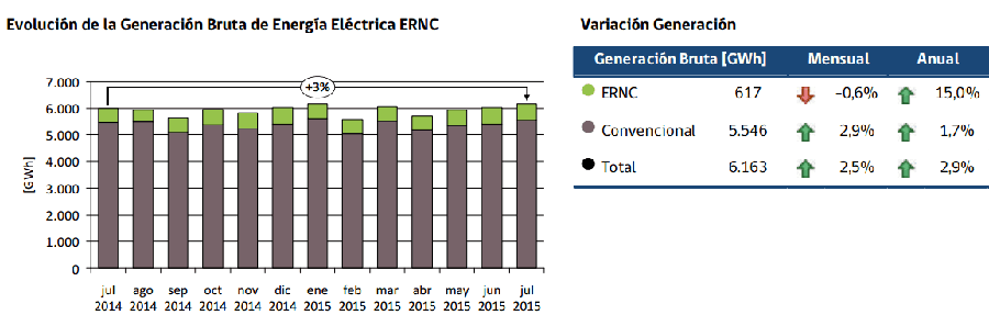 La generación eléctrica de los sistemas eléctricos mayores fue de 6.163 GWh durante el mes de julio. De este valor, 617 GWh son atribuibles a la producción de las centrales ERNC. Haciendo un análisis por tecnología, se tiene que un 32,63% (201 GWh) tuvieron origen en la biomasa, seguidos por 27,72% (20 GWh) eólicos. En tercer lugar, la inyección mini hidro, correspondientes a 21,99% (136 GWh), luego un 14,33% (88 GWh) de inyección solar y finalmente un 3,32% (20 GWh) de biogás.